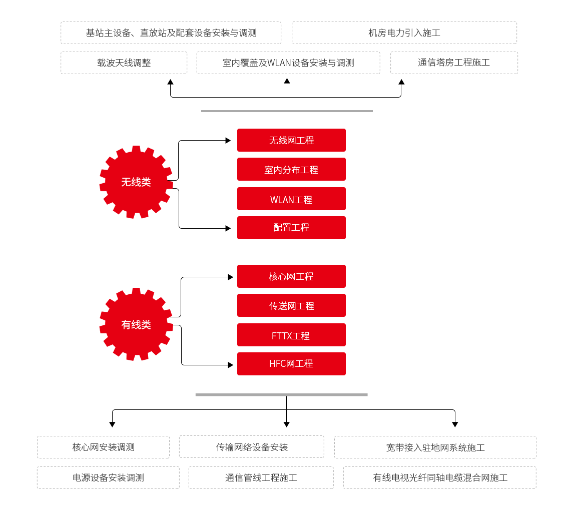 能够提供通信建设的全专业服务,业务范围包括核心网工程、传送网工程、FTTX工程、HFC网工程、无线网工程、室内分布及WLAN工程等专业。施工内容包含核心网设备安装调测、电源设备安装调测、传输网络设备安装调测、基站主设备安装调试、直放站及配套设备安装调测、室内覆盖及WLAN设备的安装调测、宽带接入驻地网、系统集成施工、有线电视光纤同轴电缆混合同施工、通信管线工程施工、载波及天线调整等;为客户提供多元化施工解决方案,以及优质的全方位服务。