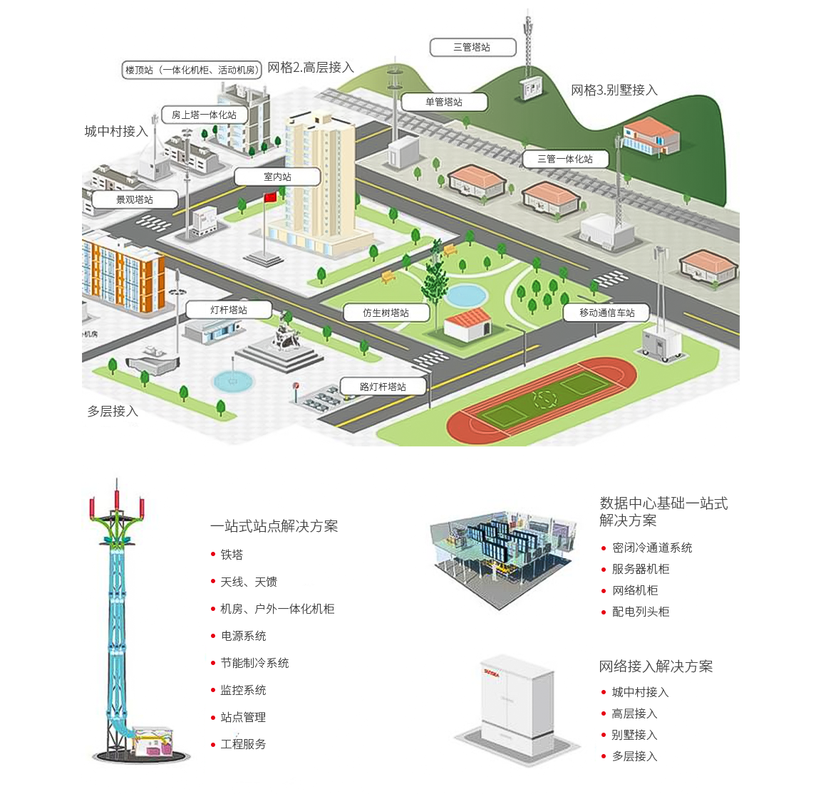 借助日海智能的产品优势,提供产品和工程相集合的集成服务,为客户提供整体解决方案。日海智能自主研发在工程中广泛应用的产品有:小基站、高低压配电柜(箱)、铜缆产品(宽带音频总配线架MDF+数字配线架DDF+综合布线系统)、光纤光缆管理系统(ODF+光无源器件+FTTX)、户外通信机房、户外一体化通信机房、网络柜、电源分配系统、槽道管理系统、移动通信天馈系统(包括各种美化天线)、美化杆塔、机房防雷配电产品、数据中心基础设施产品、楼宇智能化系统等。